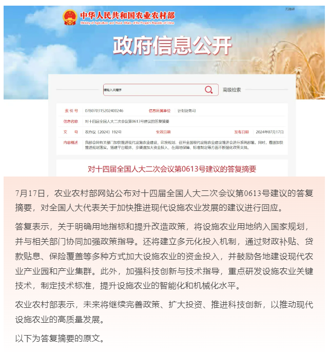 您提出的關(guān)于加快推進(jìn)現(xiàn)代設(shè)施農(nóng)業(yè)發(fā)展的建議收悉。經(jīng)商自然資源部,現(xiàn)答復(fù)如下: